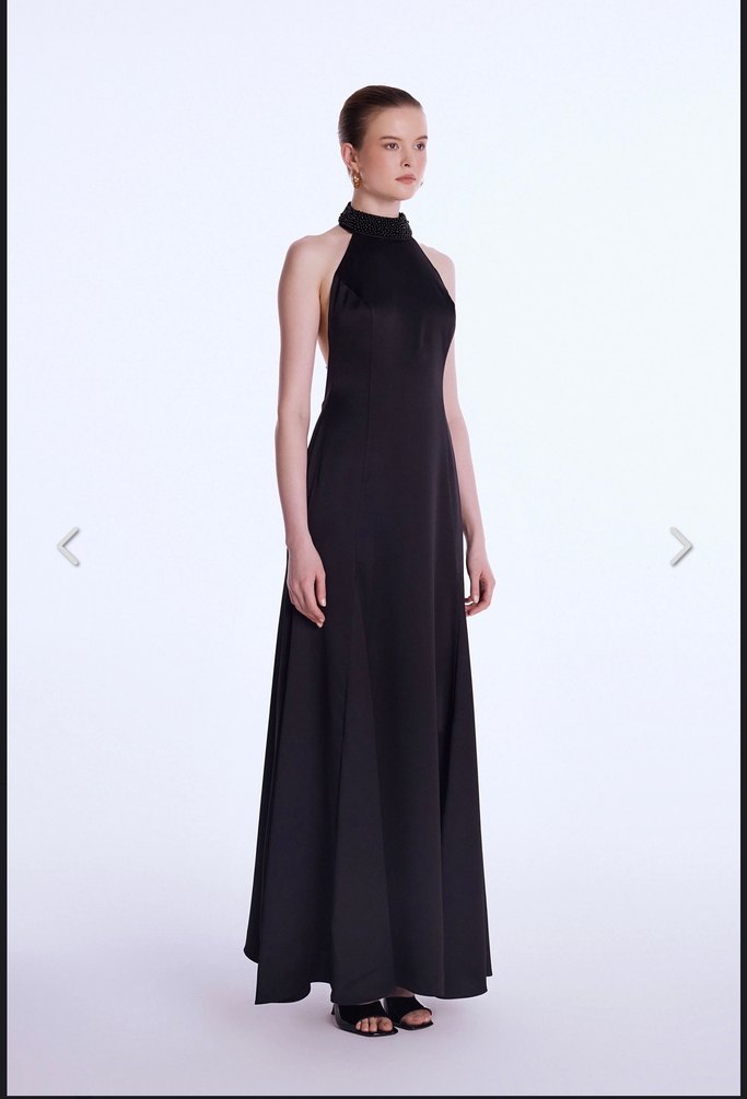 Siyah, kolsuz, uzun elbise yüksek yakalı ve drapeli tasarıma sahip, krep kumaştan ve klasik şıklık için uygun, regular fit. Nişanda 1 kez giyildi boyuma göre tadilat yaptırdım 1.70 54 kg XS bedendir kalıbı büyük 57-58 kg kadar olur.
