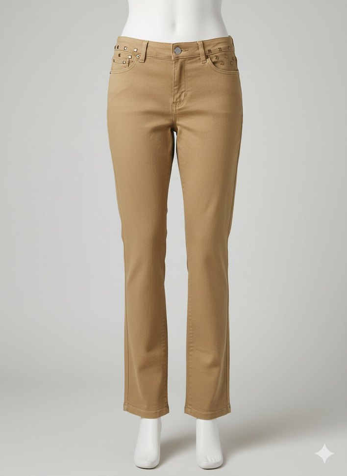 adL marka Camel rengi kemerinde taş detayları bulunan dar paça kadın pantolon
