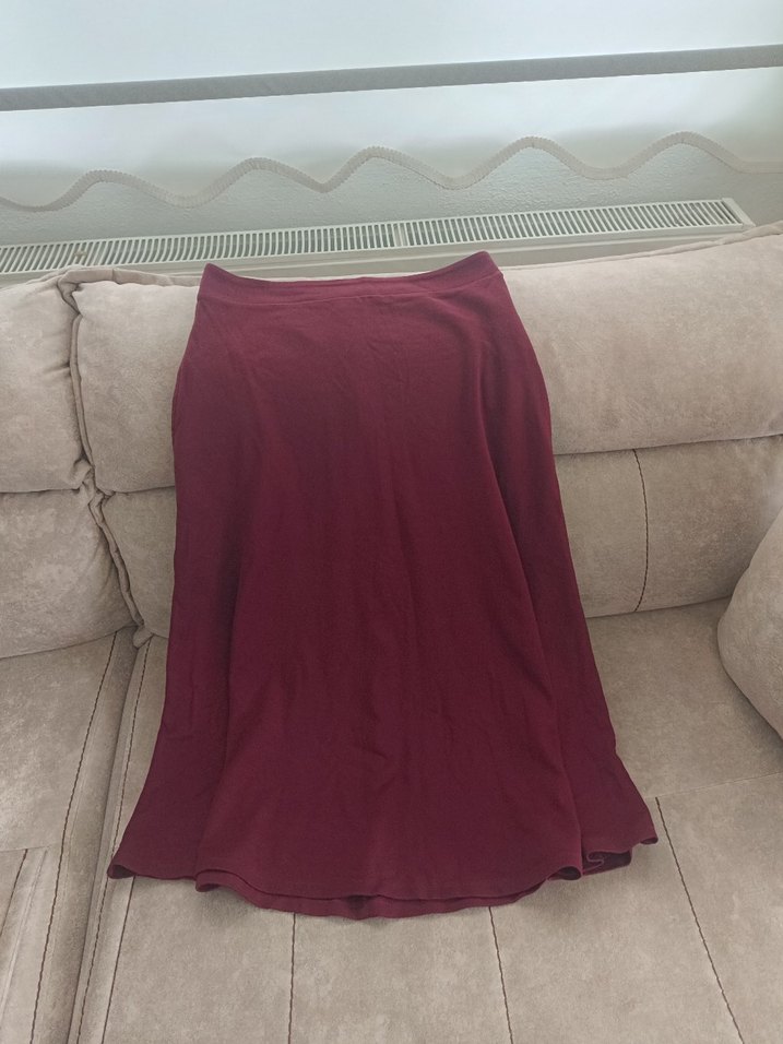 Bordo midi uzunluğunda, dökümlü ve salaş kesim kadın eteği. Düz ve desensiz, günlük kullanıma uygun rahat bir model. ürün yıkandı ancak hiç kullanilmadi