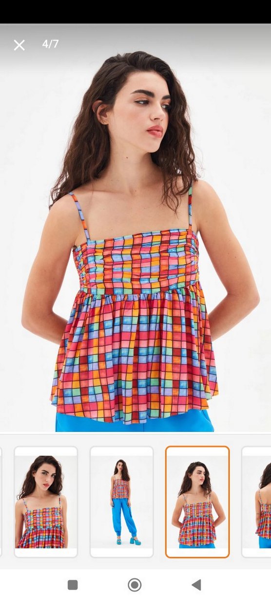 Renkli tie-dye desenli, pilili ve askılı kısa bluz. Rahat kesimli ve sentetik kumaştan, günlük kullanım için uygun. ürün bir kez kullanılmıştır pantolon boyu kisaltilmistir