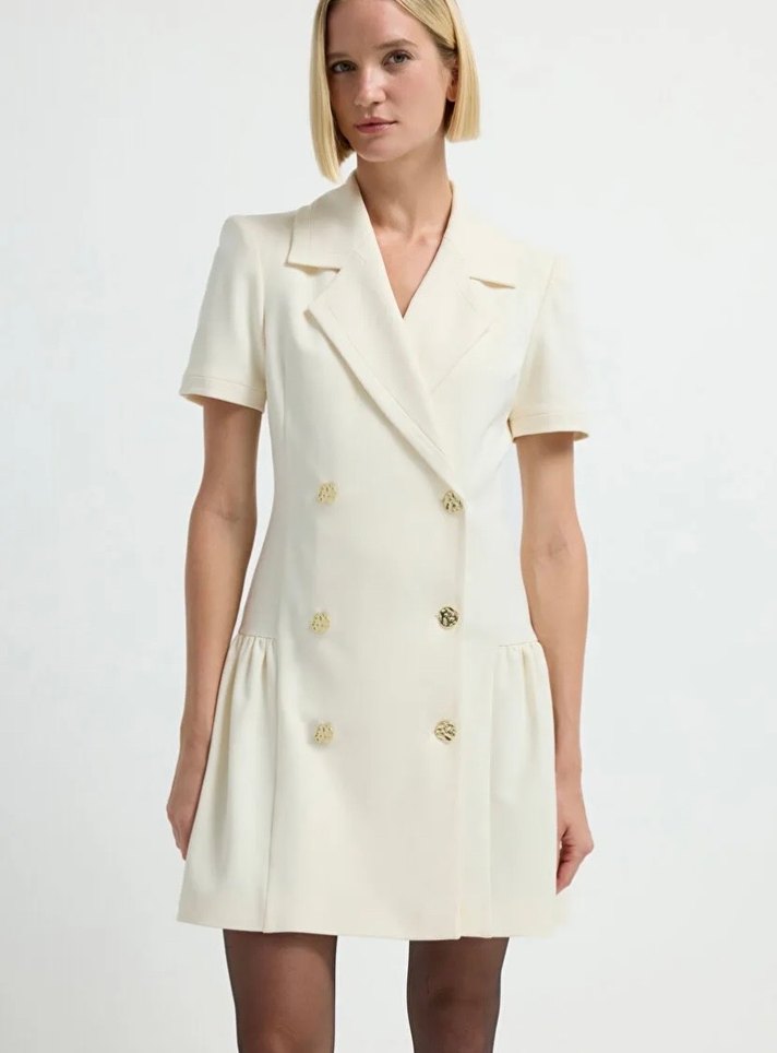 Etikwtli hatasızdır.kemik rengi gomdu düğmeli etwği piliseli,içi astarlı ve çok tok ağır kaliteli duran bir kuması var,esnemesi yoktur.#adil ışık#kruvaze elbise#yeni sezon#gold düğme#ipekyol#network#machka#