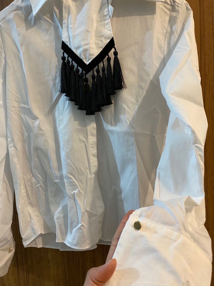 Ütülemeye vaktim olmadı, hiçbir sorunu yok yakalı, beyaz kadın gömlek, siyah püsküllerle süslenmiş. Sentetik kumaştan, nakışlı bohem tarzda, ofis için uygun, fitted kesim ve askılı kollu midi boy.