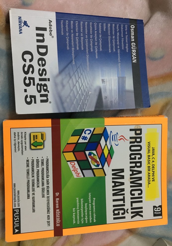 Programlama mantığı ve Adobe InDesign CS5.5 konularını içeren iki kitap, Delphi, C# ve görsel temel kavramları anlatır.