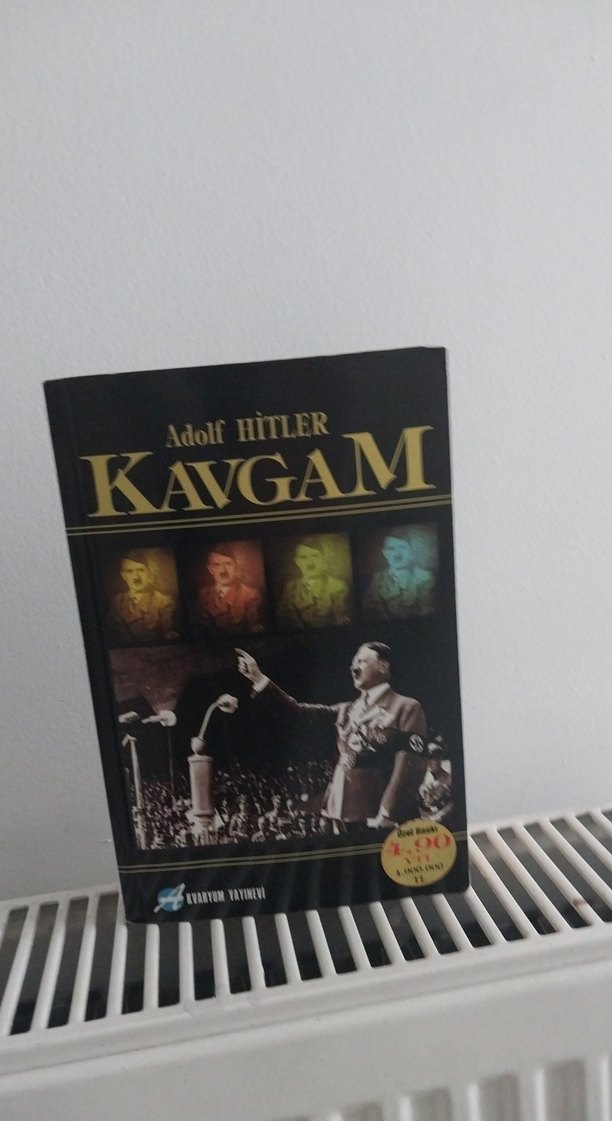 Adolf Hitler'in "Kavgam" adlı kitabı, Hitler'in çeşitli fotoğraflarını ve kalabalık bir sahneyi gösteren siyah kapaklı tarih kitabıdır.