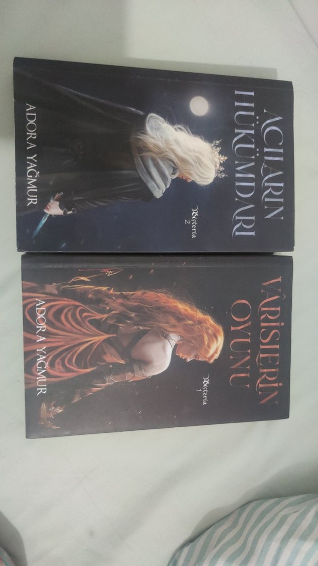 Adora Yağmur'un 'Acıların Hükümdarı' ve 'Varisleri Oyunu' adlı iki fantastik romanı, ikiside ciltsiz 2. kitabın ayracı ve posteri yok 1. kitapta ikiside var 2. kitabın kapağında az bı miktar zedelenme var çok belli olmuyo içinde çizik yok