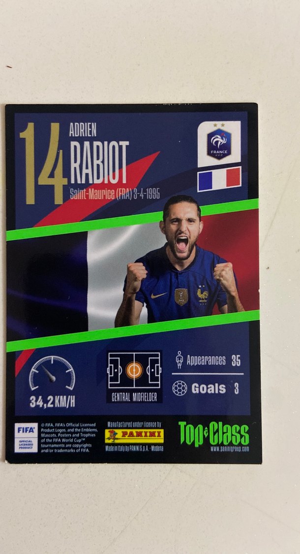 Adrien Rabiot futbol rozeti, istatistikleri ve Fransa milli takımı renkleriyle. Lacivert zemin, pop kültür tarzında tasarım. ⚽