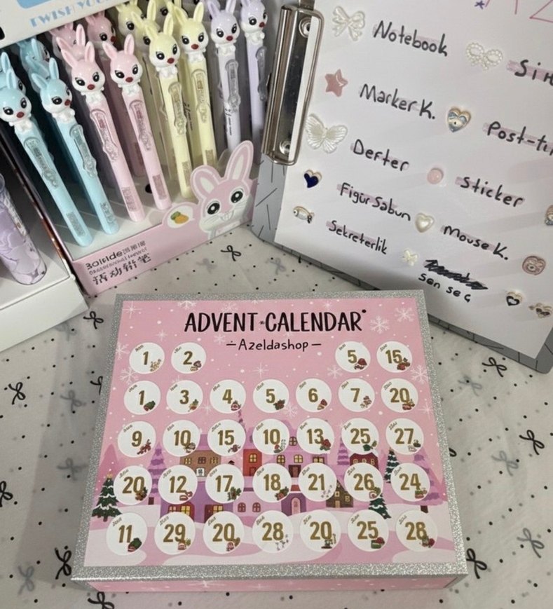 Azeldashop'un yılbaşı temasıyla hazırladığı adventcalendarın içerisinden çıkabilecekler: Marker kalemler, yüzük, kolye, küpe, bileklik, defterler, notebooklar, ajandalar, ojeler, bakım ürünleri, mini maket bıçakları, figür kalemler, sticker setleri, post-it ve daha fazlası ✨ Ürünler numaralandırılıp gönderilecektir içerisinden 6-8 ürün çıkar. Aynı gün kargo imkanı ✨