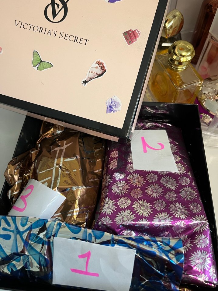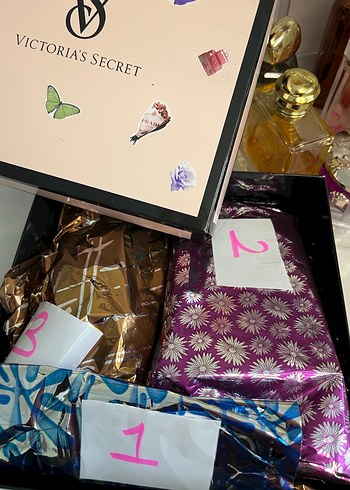 Victoria's Secret kadın parfüm seti, üç farklı süslü ambalajda, çeşitli kokular sunar.