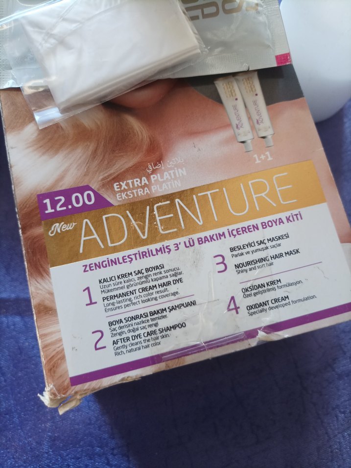 Adventure 12.00 Ekstra Platin saç boyası seti, kalıcı krem saç boyası, besleyici saç maskesi, boya sonrası bakım şampuanı ve oksidan krem içerir.