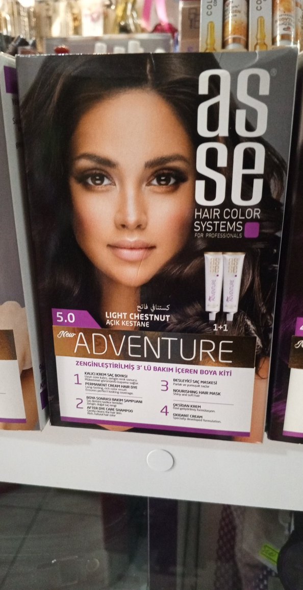 Adventure 5.0 açık kestane saç boyası kalıcı renk, bakım şampuanı ve besleyici saç maskesi içeren 3 aşamalı bakım kiti ile sunulur.