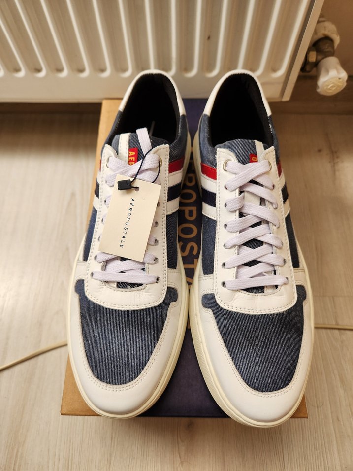 aeropostale erkek deri ayakkabi..43 numara sifir kutusunda dis yuzeyi gercek deri ve kot kumasi Beyaz ve gri renklerde, denim kumaş detaylara sahip erkek spor ayakkabısı.