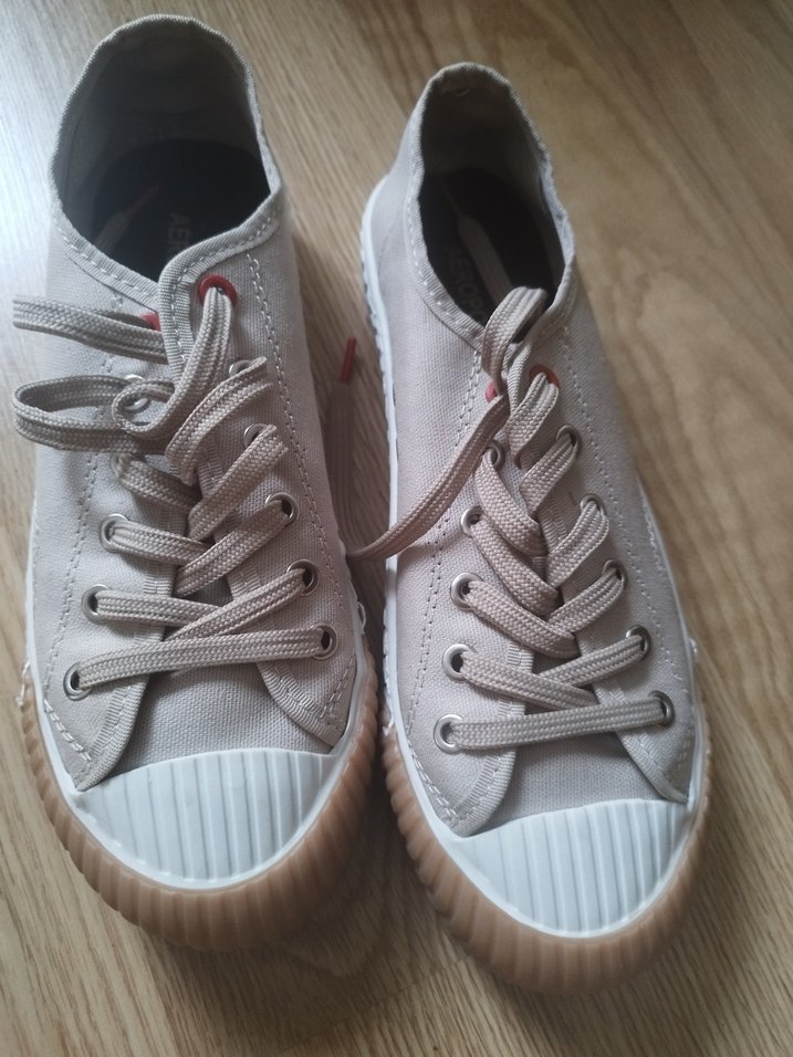 Bej renkte, bağcıklı ve dolgu topuklu kadın spor ayakkabısı. Kauçuk malzemeden üretilmiş, günlük kullanım ve sokak tarzı için uygundur. Desensiz ve gri detaylara sahiptir. Hiç giyilmedi sıfır ürün