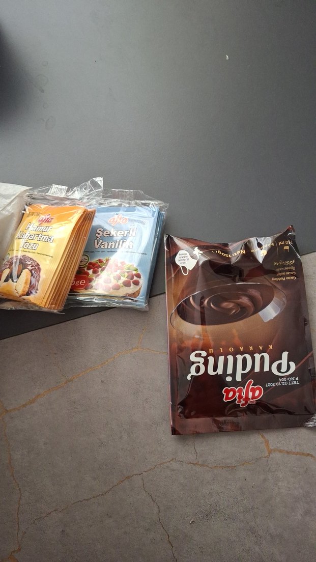 Afia markalı koyu kahverengi toz pudra. Vanilin ve şeker paketleriyle tatlandırma seçenekleri sunar.