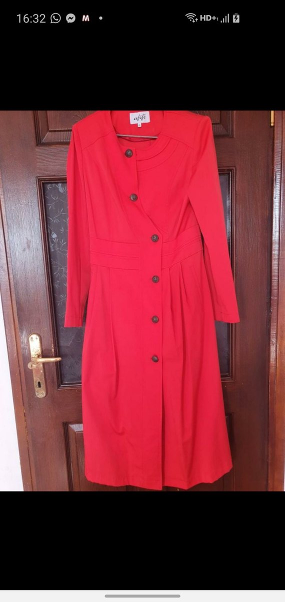 Afife marka düğmeli ve kırmızı renkte uzun kadın kabanı, kırlangıç yaka ve uzun kolludur. Sentetik kumaştan yapılmış, ofis için uygundur, modern klasik tarzda.