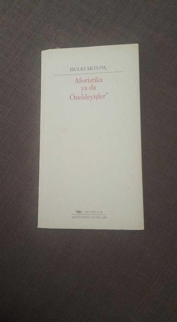Hulki Aktunç'un Aforistika ya da Özeldeyişler kitabı, Sel Yayıncılık Geceyarısı Kitapları serisinden yayımlanmıştır. Aforizmalar ve özel sözler içerir.KAPAĞINDA,SAYFALARINDA HASARLAR VAR.MÜTFEN HASARLARINI KABUL EDİYORSANIZ ALINIZ.2001 BASKI.ÇİZİK YOK.