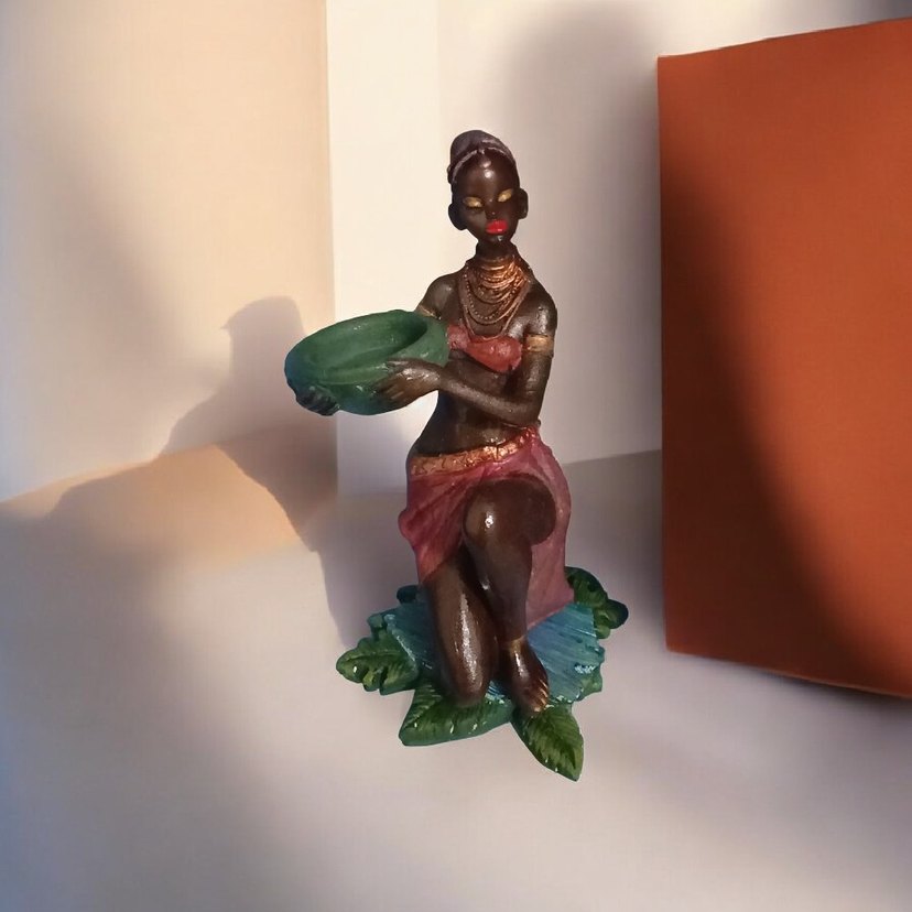Kahverengi kadın figürlü biblo, yeşil kase tutuyor, kolyeler ve koyu pembe etekle süslenmiş. Dekoratif ve ayrıntılı.