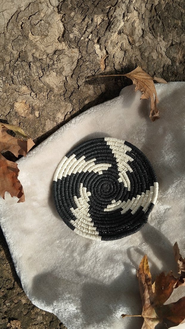 Siyah ve beyaz renkte , kağıt ip ile örülmüş dekoratif tabak. Ev dekorasyonu için uygundur. 21 cm . tek ürün fiyatıdır. istenilen ölçü ve motifte sipariş alınır