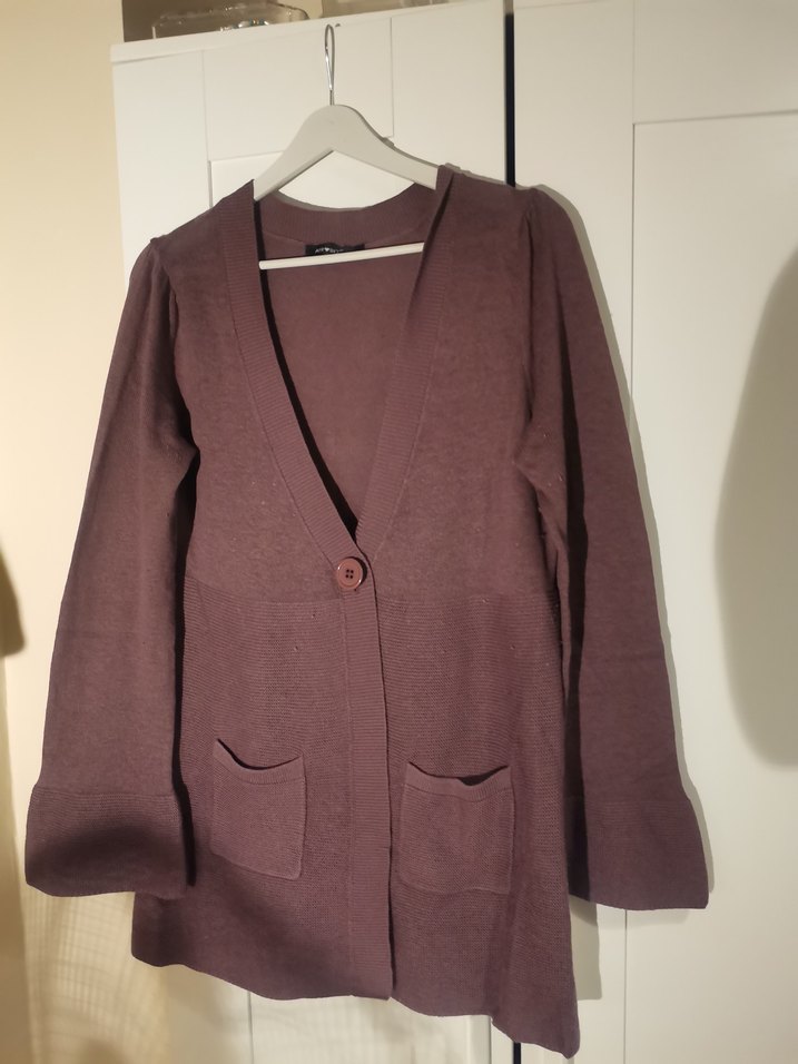 Mor renk, düğmeli ön, kesik yaka ve uzun kollu, bol kesim midi uzunlukta kadın hırka. Rahat bir kesimi vardır.