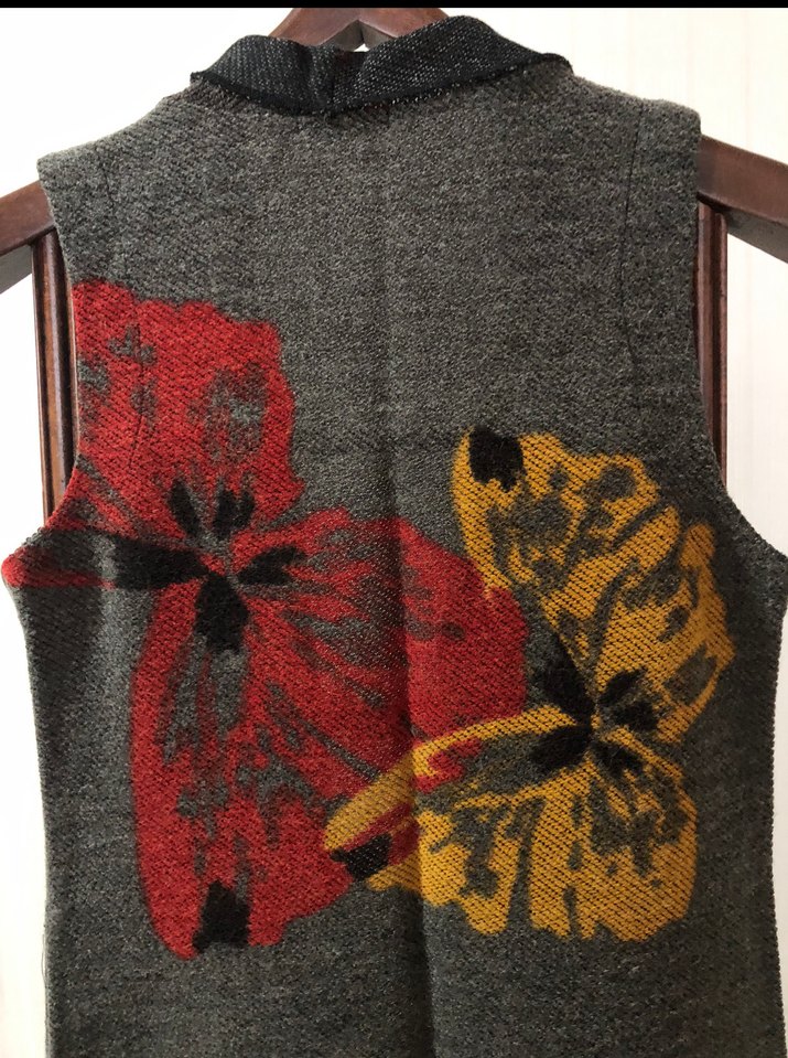 Gri tabanlı, uzun ve kolsuz örgü bohem kırmızı ve sarı desenler ile süslenmiştir asimetrik hırka Rahat ve salaş kesimlidir. Esnetmeden ölçüleri iki kol arası 46 cm omuzdan boy 84 cm kullanılmadı