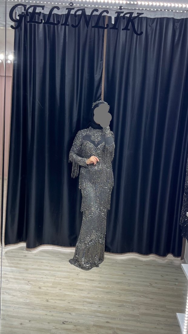 Yüksek yakalı ve uzun kollu, drapeli desenli gri uzun abiye elbise. Düzenli kesimi ve klasik zarafetiyle, gösterişli gotik tarzda, düğünler için uygun.