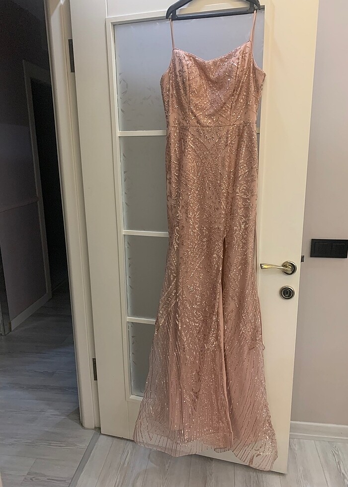 Kına gecemde 1 kez after elbise olarak giyilmiştir. Önde yırtmac detayı bulunmaktadır. Sırt dekoltelidir. Sim detaylıdır. 38/ 40 bedene uygundur