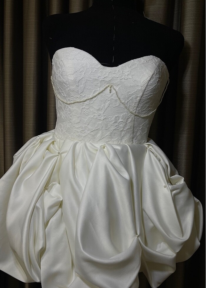Kendi tasarımım olan bu elbise, tamamen el yapımıdır. Üst kısmı dantel detaylı, straplez kesimdir. Etek kısmı saten kumaştan yapılmış olup elde balon form verilmiştir. İnci detaylarıyla zenginleştirilmiştir. Nişan, kına, bridal shower, after party veya konsept fotoğraf çekimleri için mükemmeldir! 1 kez prova amaçlı giyildi. Hiçbir kusuru yoktur. Tek ve özel bir parçadır. Benzerini bulmanız çok zor! • “Bridal Shower / Nişan / After Party için ideal” • “Dolap’ta satışta — @zehrakutruu” • Beden: 34–36 • Göğüs: 91 cm / Bel: 66 cm Kumaşlar: Dantel + Saten Astar: dantel astar Var Kapatma: Arka fermuar ve bağcık Kullanım Durumu: Sıfır (provalık