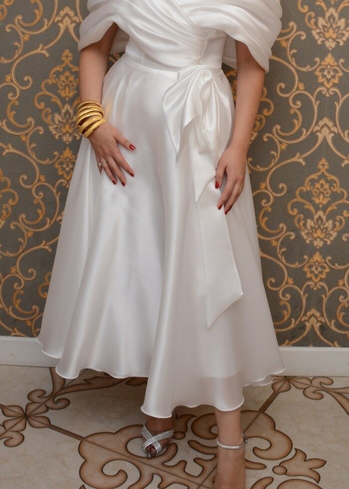 Beyaz caroline organze after elbisesi kına afterında kullandım 38 40 beden uyumlu arkası biyeli midi boy askılı kuru temizlemesi yapıldı hiçbir deformesi yok