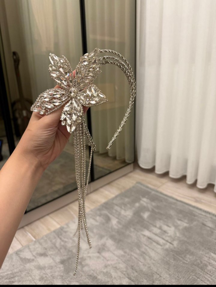 Beyaz metal taç, büyük pul işlemeli çiçek ve sarkan zincirlerle göz alıcı ve bohem bir tarz sunar. ✨