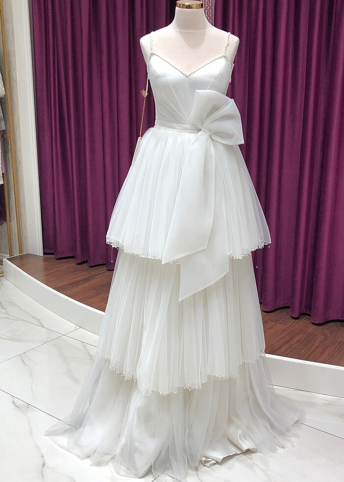 After veya nikah elbisesi olarak kullanılabilir. Sırtı brit bağlama olduğu için 38-40-42 bedene kadar uyumludur. 3 kat fırfırdan oluşup, inci detaylı ip askıları mevcuttur. Belindeki kurdele detayı da ayrı bir hava katmıştır.