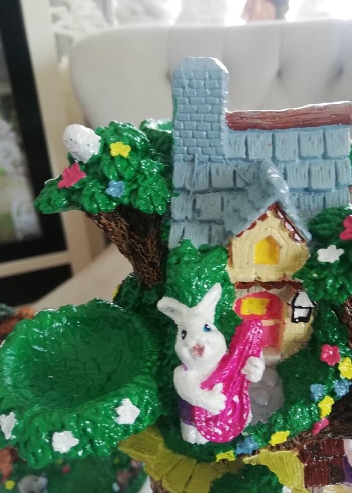 Ağaç orman evi ve yanındaki sallanan tavşanlar dahildir