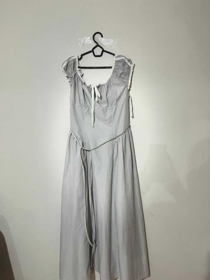 Gri keten uzun elbise, drapeli detaylı, askılı kollu ve halter yaka. Salaş kesimiyle günlük kullanıma uygun, avangart sokak stili.
