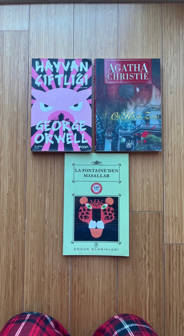 George Orwell'in Hayvan Çiftliği, Agatha Christie'nin polisiye romanı on küçük zenci ve La Fontaine'den çocuk klasiklerini içeren üç kitaplık set.