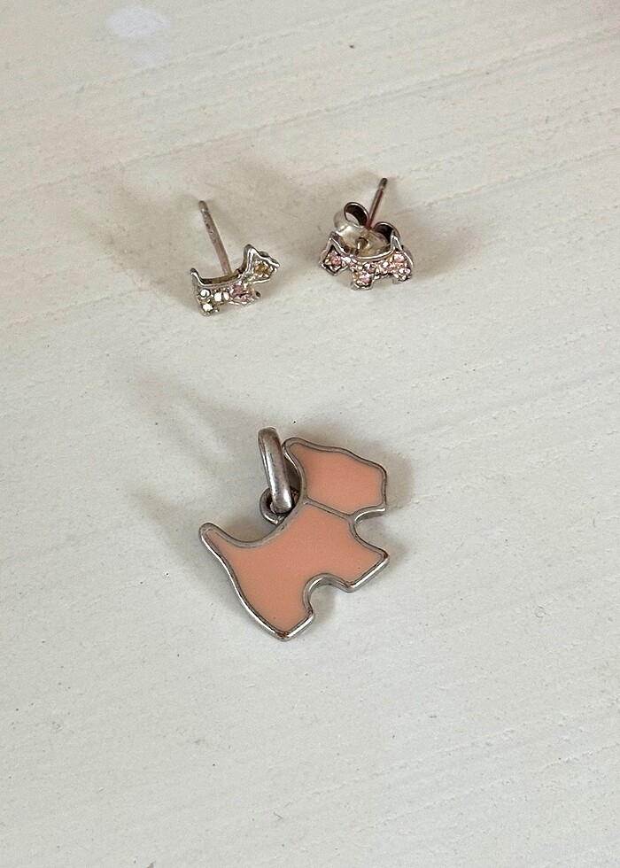 90’lar ya da 2000lerin başından vintage scottie köpek şeklinde kolye ucu ve taşlı küpeler Kararmışlardı, biraz temizledim ama biraz daha temizlenebilirler. Hepsi gümüş, küpelerde damga var; kolye ucu zincirle birlikte satılıyordu hem gümüş hem agatha damgası onun ucundaki parçadaydı o nedenle kolye ucunda damga yok. Aynısını internette buldum oradan görebilirsiniz (son 2 görsel), orada satılık olan zinciriyle, bendekinin zinciri durmuyor o nedenle fiyatını çok daha düşük tuttum. Küpenin tekinin arkası ve birkaç taşı düşmüş, taş taktırabilirsiniz, normalde Agatha bu tip onarımları yapıyor ama artık Türkiye’de olmadığından bir kutumcuda halletmeniz gerekiyor.