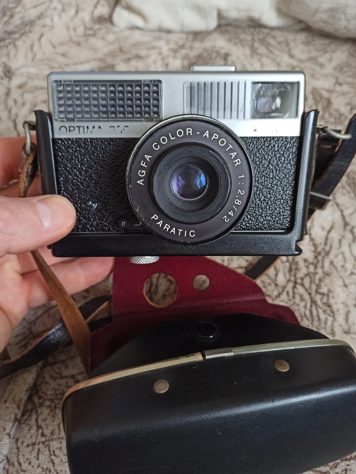 Agfa Optima 200 siyah renkli filmli fotoğraf makinesi, Color-Apotar 42mm f/2.8 lens ile donatılmıştır. Deri kılıfı ve "ARATIC" yazısı bulunmaktadır.