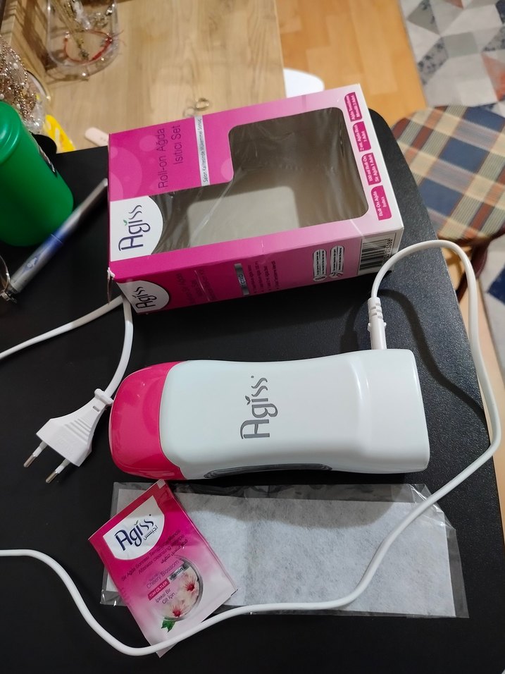 Agis pembe ve beyaz renkli ağda ısıtıcı cihaz, kablosu ve küçük ağda bant paketi ile birlikte gelir. Kişisel bakım için uygundur. ️pazarlık payı var