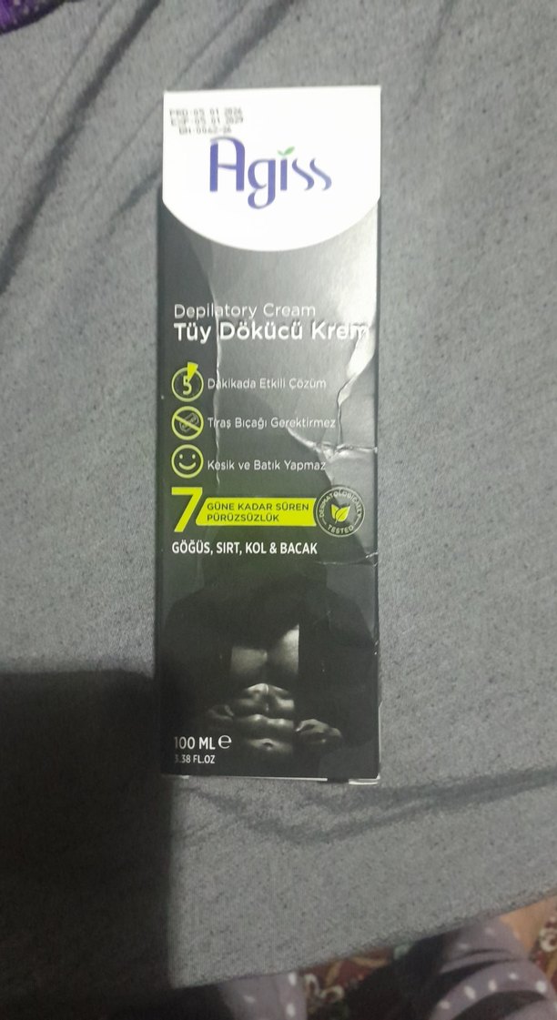 Agiss tüy dökücü krem, 5 dakikada etkili çözüm sunar. Kesik ve batık yapmaz. 7 güne kadar pürüzsüzlük sağlar. Göğüs, sırt, kol ve bacaklar için uygundur. 100 ml.