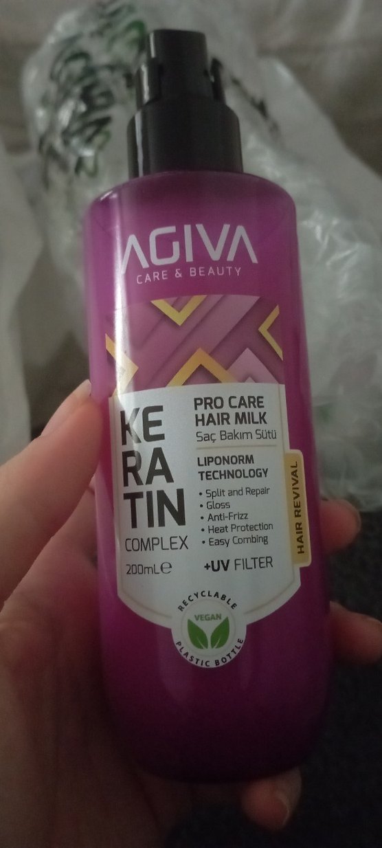 SIFIR ÜRÜN. Agiva Pro Care Saç Bakım Sütü, keratin kompleksi ve Liponorm teknolojisi ile kırıkları onarır, parlaklık sağlar, elektriklenmeyi önler, ısı koruması ve kolay tarama sunar. Vegan