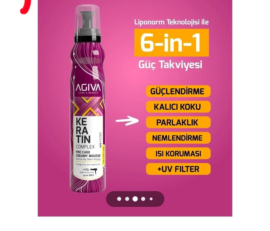 Agiva Keratin Kompleksli krem köpük, güçlendirme, kalıcı koku, parlaklık, nemlendirme, ısı koruması ve UV filtre özellikleri sunar. hiç kullanılmadı.