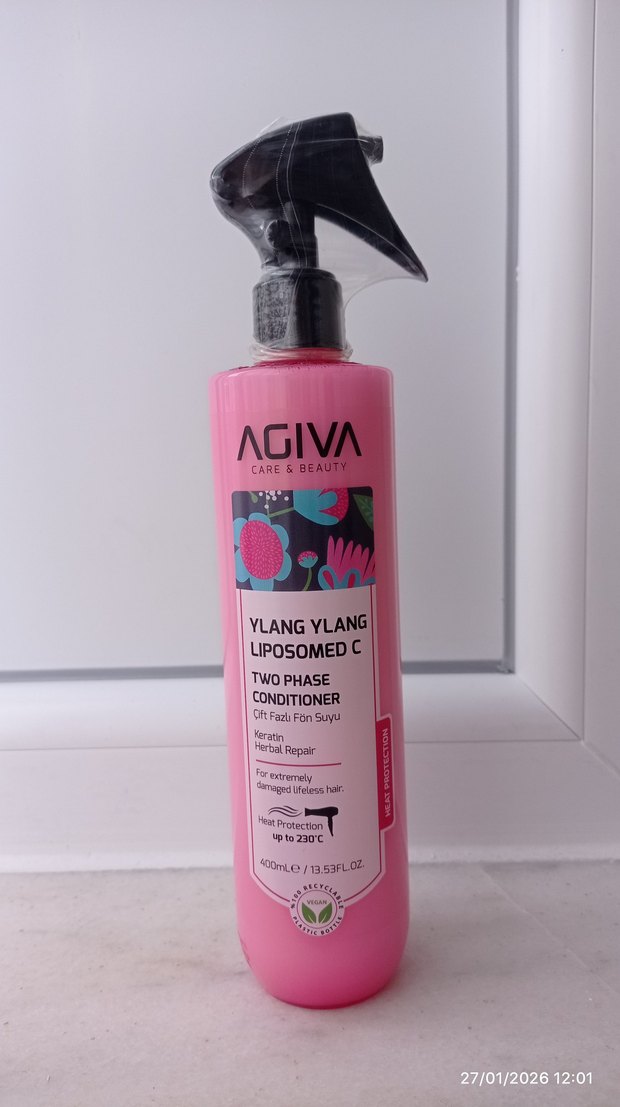 Agiva Ylang Ylang İki Fazlı Saç Kremi, keratin ve bitkisel onarıcı içerir. Çok yıpranmış saçlar için 230°C'ye kadar ısı koruması sağlar. SIFIR ÜRÜN