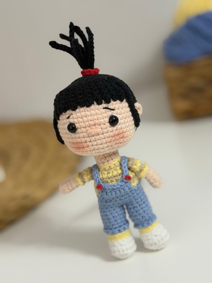 Sarı tişört ve mavi tulum giymiş, kırmızı bantla toplanmış örgü saçlı el yapımı örgü Agnes Yumuşak ve renkli tasarım.