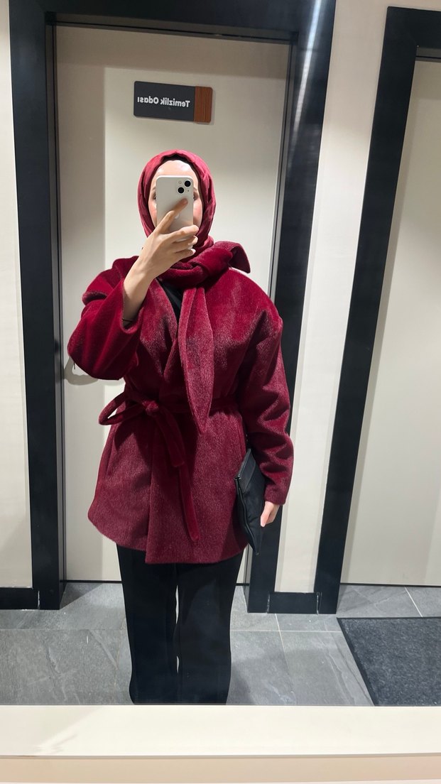 Ahel tasarım Bordo midi uzunlukta, bol kesim ve uzun kollu kaban. Yumuşak ve sıcak kumaştan, kürklü detaylara sahip, günlük kullanıma uygun.