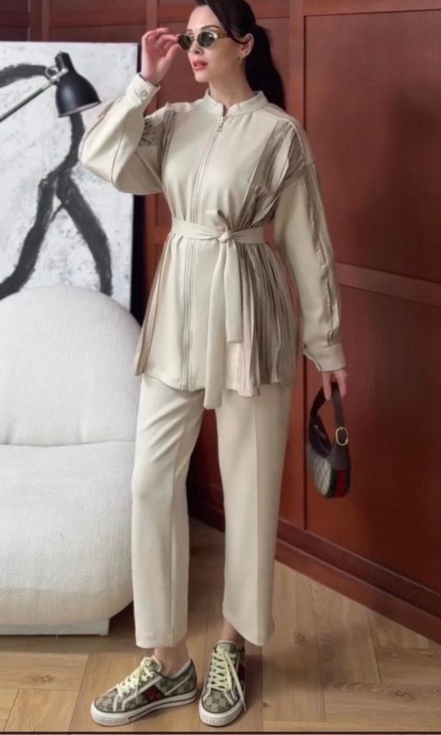 Kadın takımı, uzun boy ve normal kesim. Yumuşak sentetik kumaştan, uzun kollu, yüksek yakalı ve kuşaklı. Açık bej renkte, günlük rahat kullanım için uygundur.