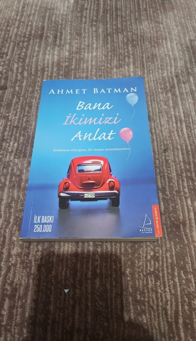 Ahmet Batman'ın "Bana İkimizi Anlat" adlı kitabının ilk baskısı. Kapağında kırmızı klasik araba ve balonlar bulunuyor. Duygusal bir anlatı içerir.