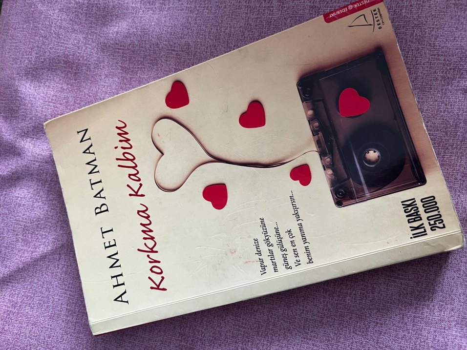 Ahmet'in 'Korkma Kalbim' romanı, aşkı ve duygusal hikayeyi simgeleyen kaset ve kalp şekilleri içeriyor.
