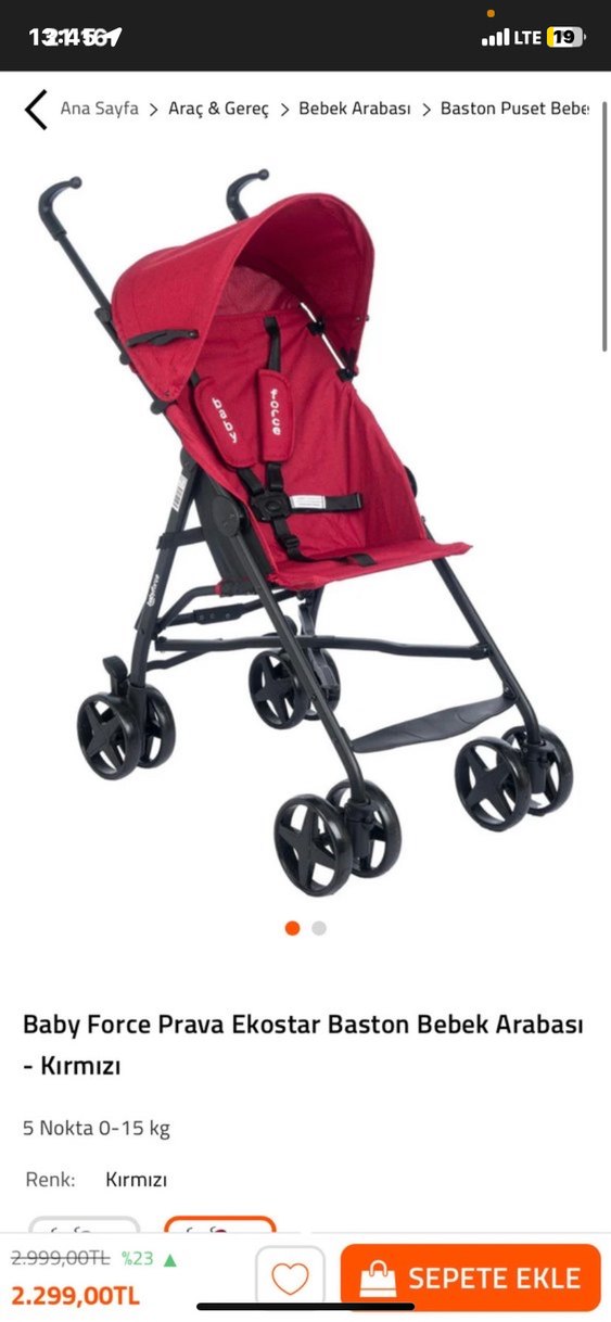 Baby Force Prava Ekostar kırmızı baston bebek arabası, hafif iskelet, dört tekerlek ve güvenlik kemeri ile donatılmıştır. Güneş koruyucu tente vardır.