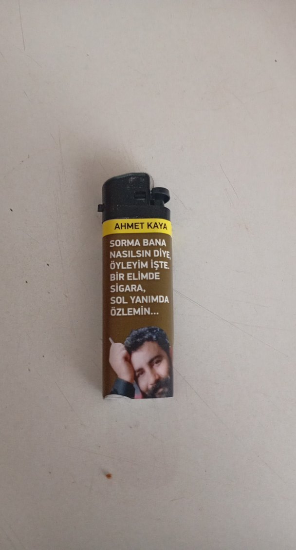Ahmet Kaya ve şarkı sözlerinin basılı olduğu koyu kahverengi çakmak. Üst kısmı siyahtır ve yazılar net şekilde görünür.