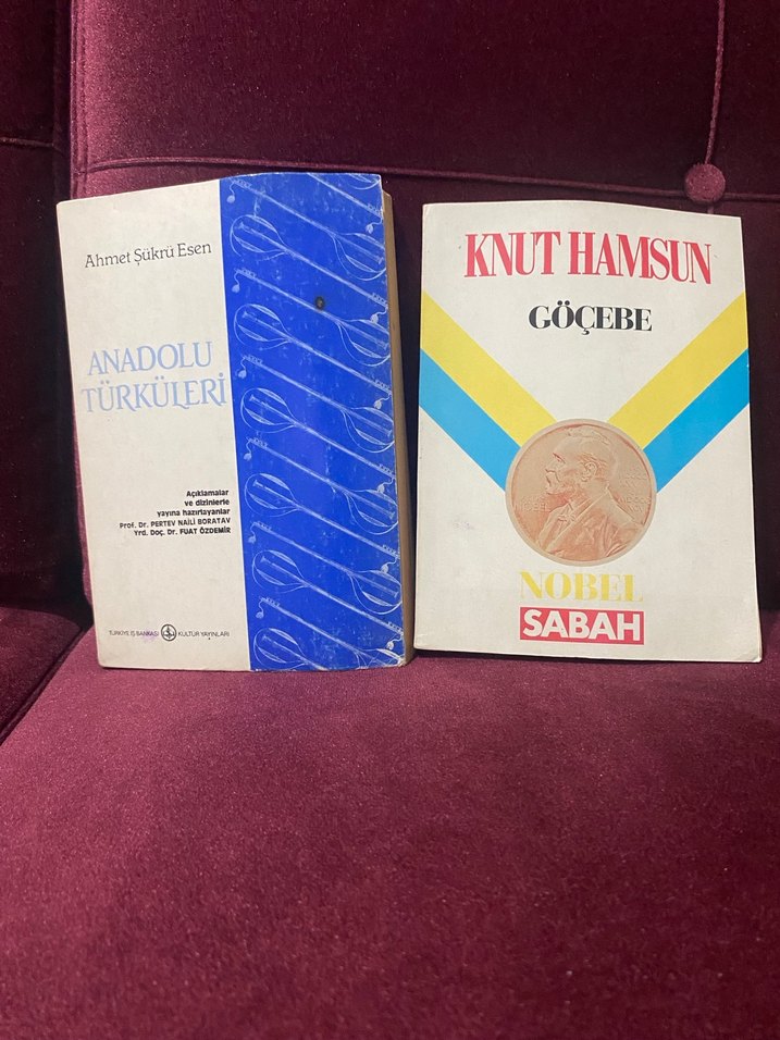 Ahmet Şükrü Esen'in "Anadolu Türküleri" ile Knut Hamsun'un "Göçebe" kitapları, Nobel ve Sabah etiketli.