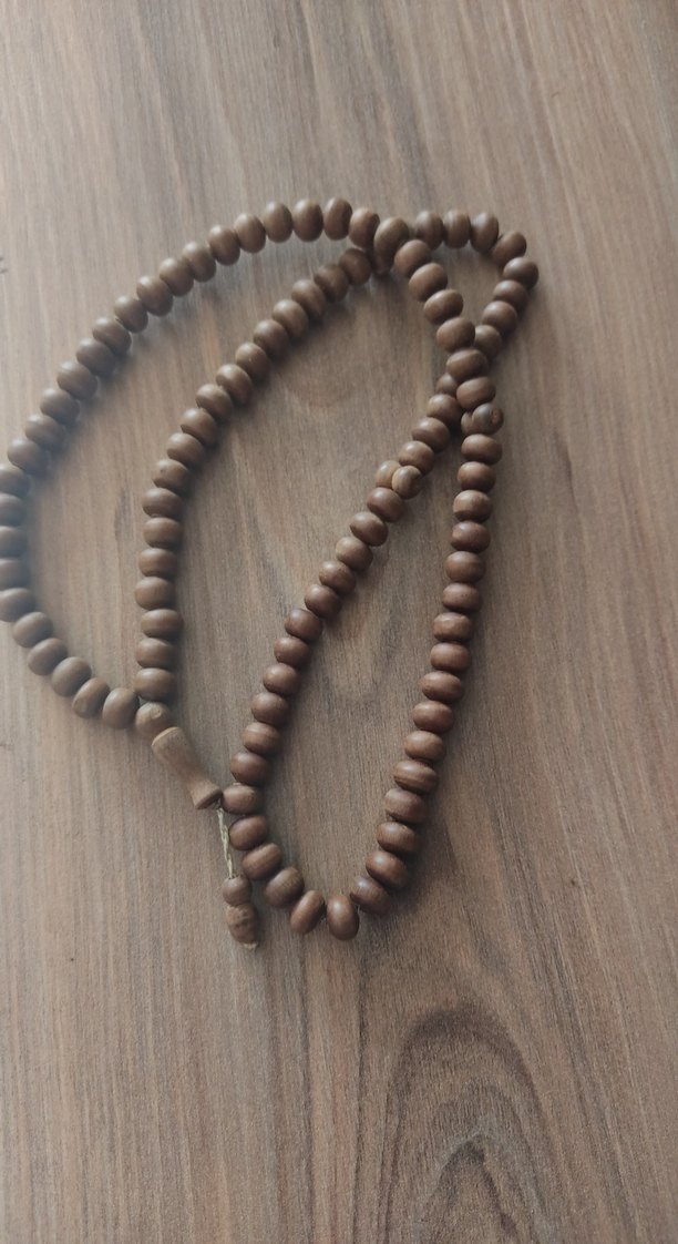 Parlak, pürüzsüz kahverengi ahşap boncuklardan oluşan minimalist ve bohem tarzda tesbih. Günlük kullanım veya manevi aksesuar olarak uygundur.