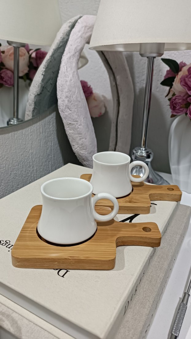 Yuvarlak kulplu beyaz porselen fincanlar, kulplu dikdörtgen ahşap altlıklarda sunulmaktadır. Minimalist görünüm için seramik ve doğal ahşap birleşimi. ☕