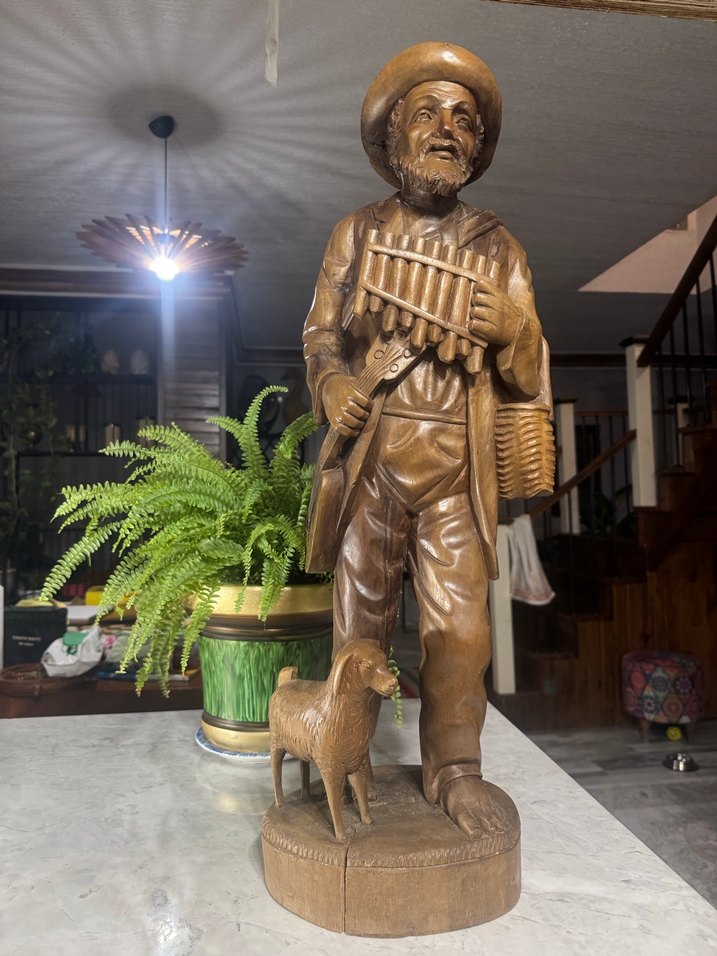 Koyu kahverengi ahşaptan yapılmış, flüt tutan ve yanında küçük bir koyun bulunan adam figürü, detaylıca oyulmuş ve şapkalı.boy:77 cm